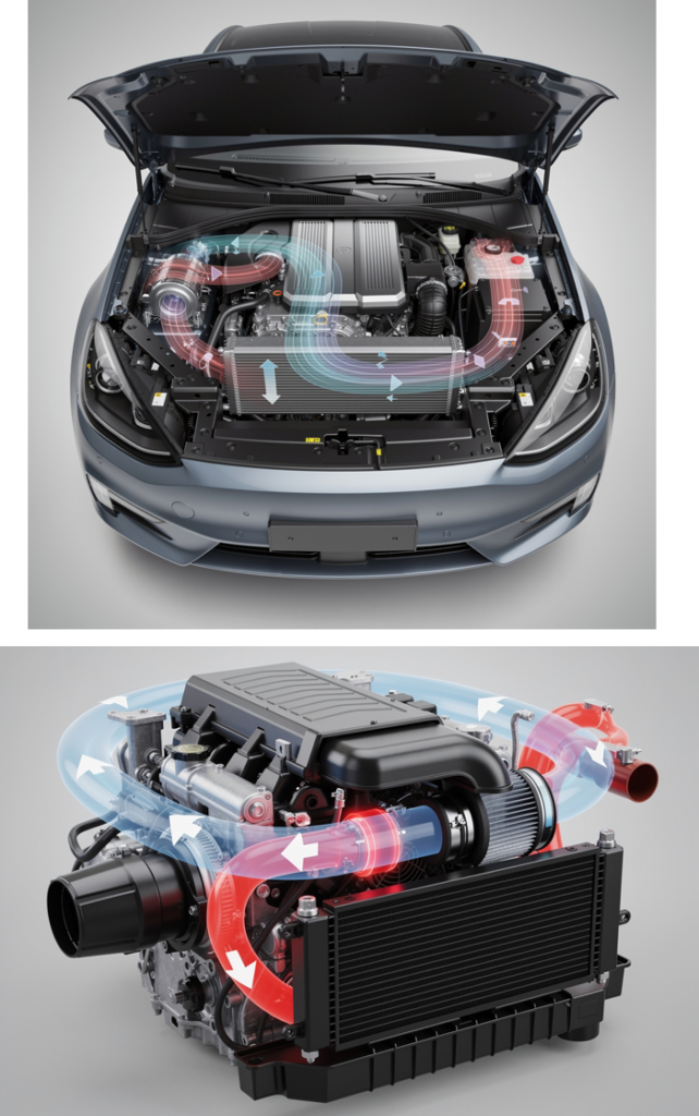 Schéma de pièces sous capot moteur (Refroidisseur d’air de suralimentation, Collecteur d’admission d’air, Résonateur et Conduits d’air) (illustration AI)
